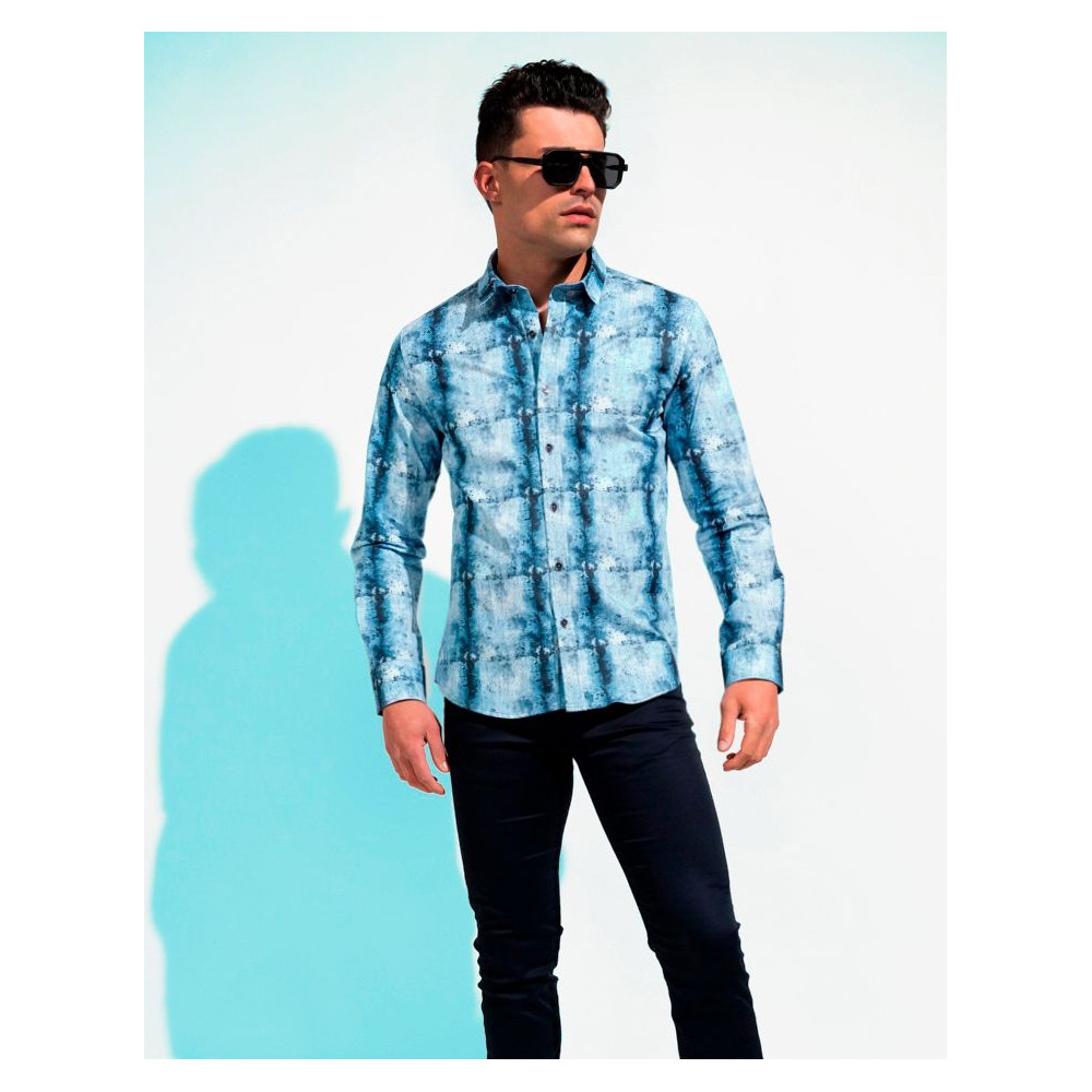 CAMISA AZUL ESTAMPADA.AJUSTADA,MANGA LARGA,ALGODÓN SUAVE Y ELÁSTICO PARA UN AJUSTE CÓMODO.DISEÑADO Y FABRICADO EN ESPAÑA.